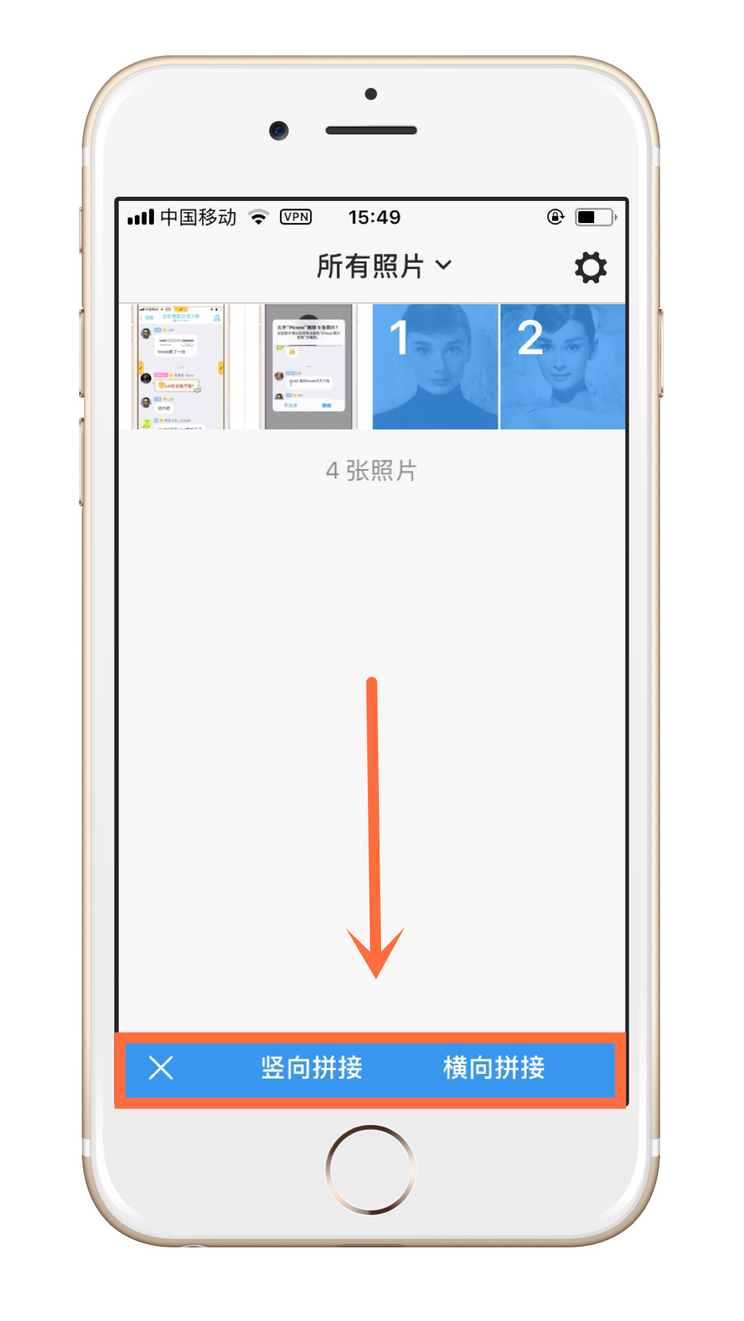 ▼ 打开Picsew,选择几张需要进行拼图的图片,下方会出现两个功能选项,点击「竖向拼图」或「横向拼图」即可